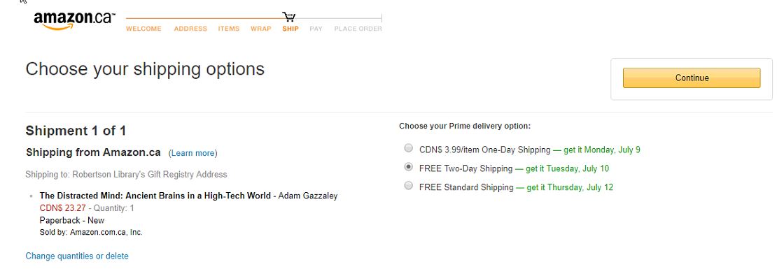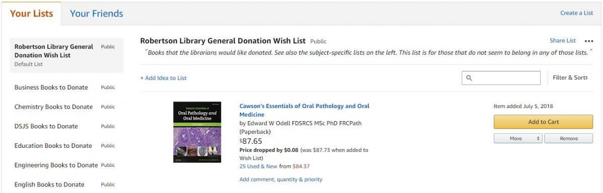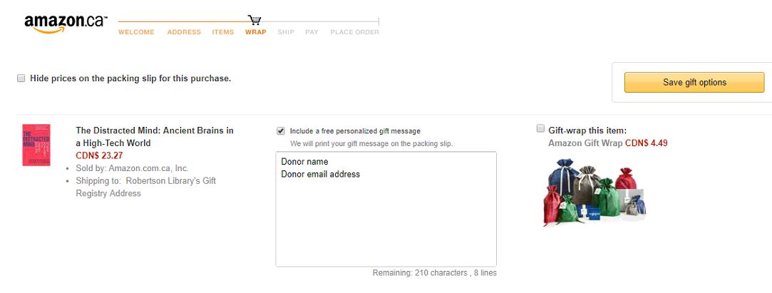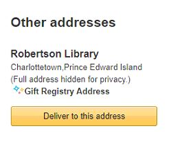 You will need to have or create an Amazon account to participate. However, you can view the wish lists without an account and purchase a book for the library elsewhere. If you do, please immediately contact collections@upei.ca to notify us of which book so we can remove it from our Amazon wishlist. Bring it to the library and include a slip with your name and email address so we can follow the rest of our procedure as below.