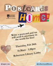 Send a postcard home! On Thursday February 26 from 11:30a-1:30p, at the Robertson Library, write a postcard to your family and friends back home. We provide the postcards, and we will mail them for free, anywhere in the world. Brought to you by the Robertson Library and the International Student Office.