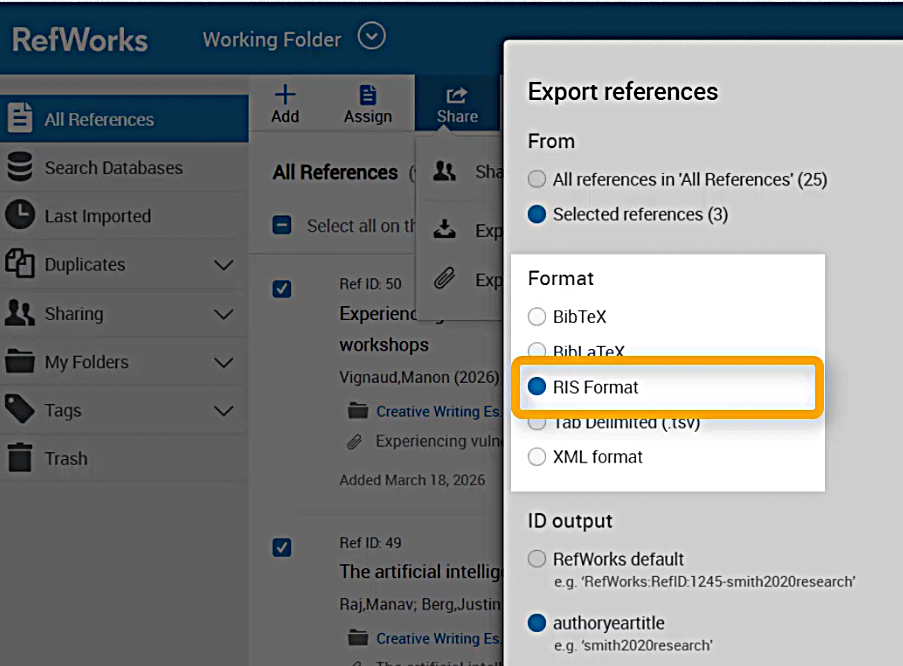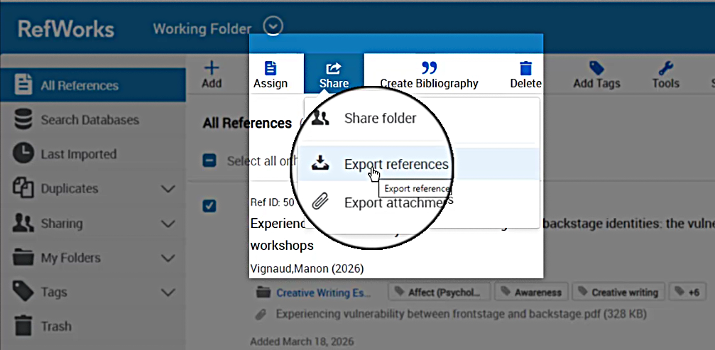 If you want to export only certain references, select them using the checkbox on the left, then select “Share.”
