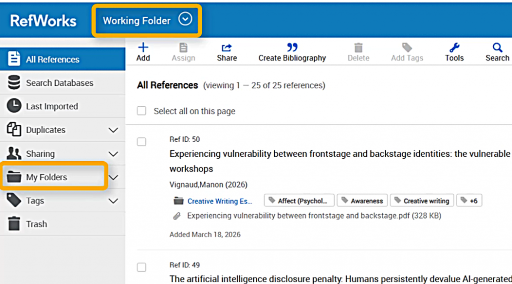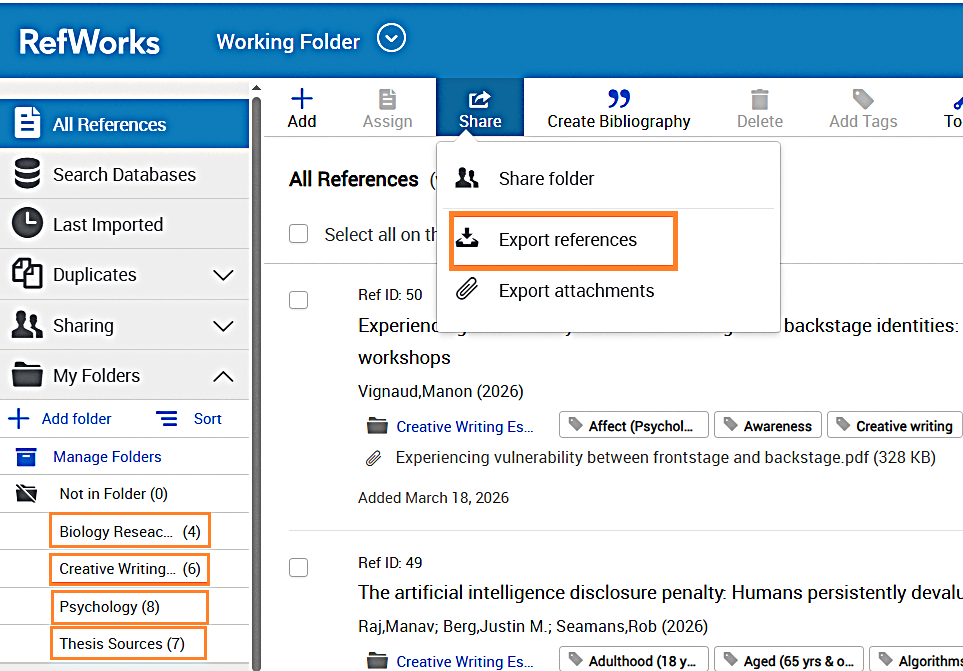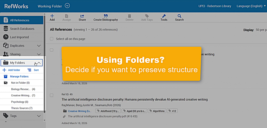 • If you use Folders in RefWorks, you will need to decide whether preserving your file structure is important. If you want to keep your references in their folders, you will need to export data from each of them separately.