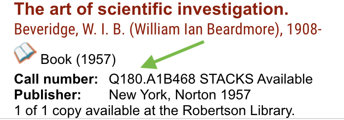 If you have found a print book in the Library catalogue, the call number is listed under the author's name and the item type. In the image below, the call number is Q180.A1B468. The letters, numbers, and decimal point are all important.