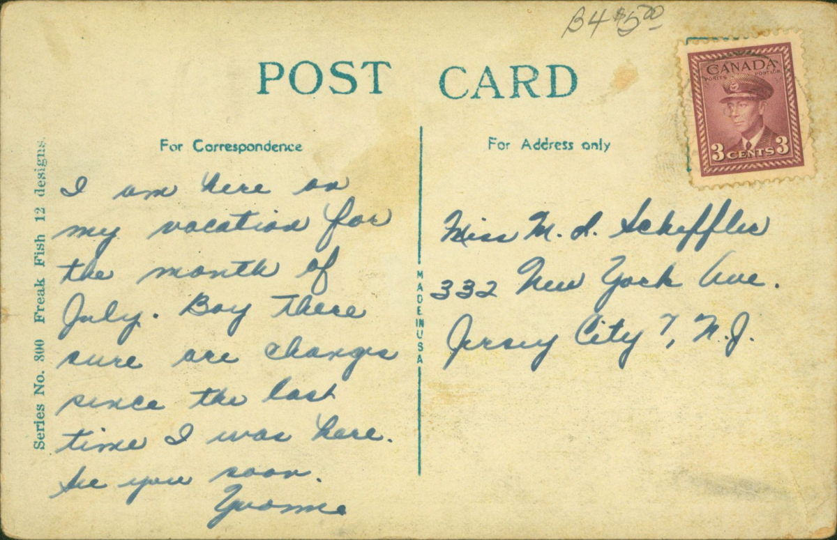 This particular postcard was sent from someone vacationing in PEI to an acquaintance in Jersey City, NJ.