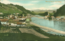This image of Murray River appears to be edited to exaggerate the village's landscape. In the days before Photoshop, different techniques were used to enhance images. We can't say for certain, but it looks like the photo was spliced to include a different background from another photo. If anyone is familiar with the Murray River area, let us know what you think!
