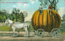 For the 4th day of the 12 Days of PEI Postcards we have another tall-tale postcard, but with a fairy-tale twist. This postcard sent in 1911 features a pumpkin carriage pulled by a team of horses. As we know from the fairy-tale Cinderella, the fairy godmother turns the pumpkin into a carriage. We're unsure of the connection between this postcard and the fairy-tale, other than to promote large pumpkins in PEI, but we can assume that the pumpkin was drawn past midnight...