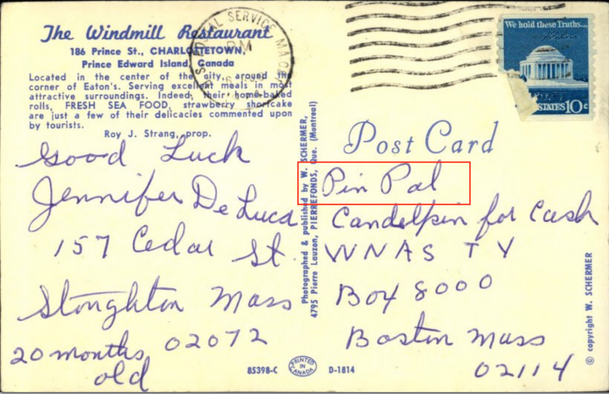 Today's postcard for 12 Days of Postcards is featured on a popular TV show in the 1970s. Candlepins for Cash was a Boston-based TV show that premiered in 1973. Contestants would bowl on the show to win money. A portion of the show was dedicated to randomly pulling out postcards from a batch to win a prize. If the contestant won, so did their “Pin Pal.” A number of postcards were sent from the Island to the show. They would write clever messages to wish their potential partner good luck.