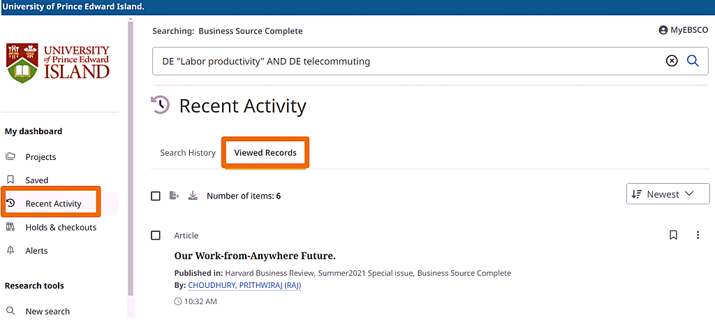 If I want to see an article that I clicked on earlier, I can use the “Recent Activity” section in the menu on the left side of the page. On this page, there are two sections: Search History and Viewed Records.