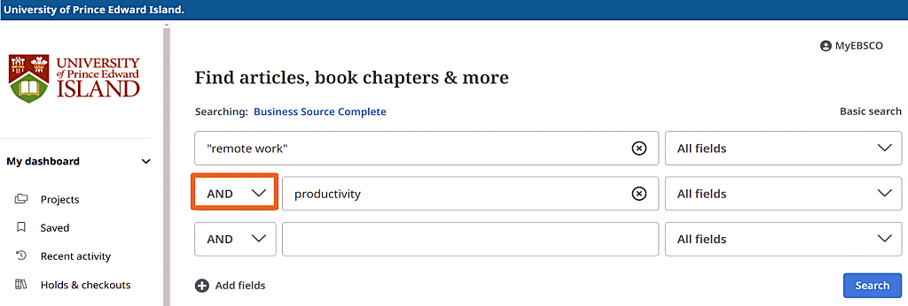 I will put the first keyword, remote work, into the top search box. Because there are two words in the phrase “remote work,” I’m going to put quotation marks around it. Then, I will put the second keyword, productivity, in the next search box. Note the use of AND between these boxes, to specify that we want results that use both concepts.