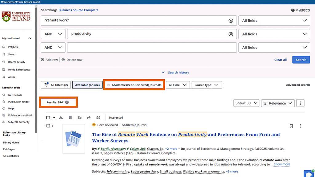 Now, I only have 974 results. I could filter them further to include only peer-reviewed journal articles (using the Peer Reviewed button), only items in a particular language, or any other requirements I think are useful. But for now, let’s look at these results.