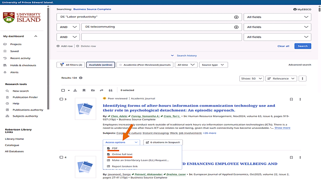 Each item has a dropdown menu labeled “Access Options.” I can access the full text by choosing a link that mentions “full text,” a file format such as PDF, or “Check@UPEI (Full Text Finder).” Different items might have different sets of links. The PDF and “Online full text” links will open in the current tab, while other links will open in a new tab or window.