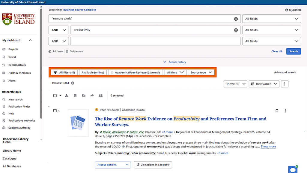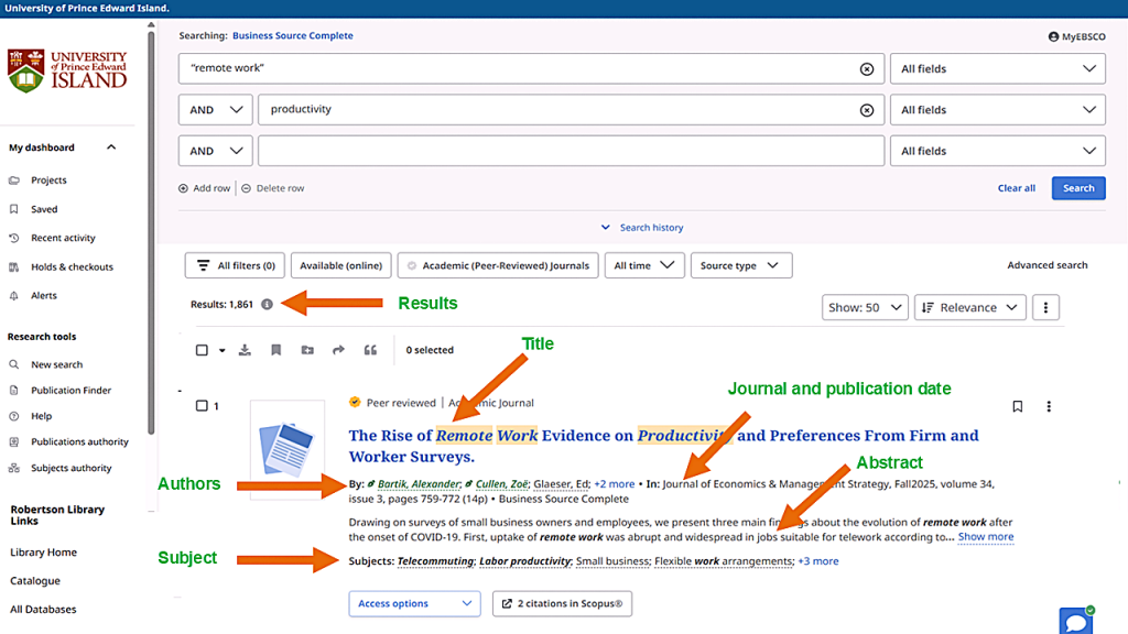 In Business Source Complete, a standard set of subject terms are used to help organize the articles. Here, I see the term “telecommuting” used for remote work, and “labor productivity” used as a more specific term for productivity.