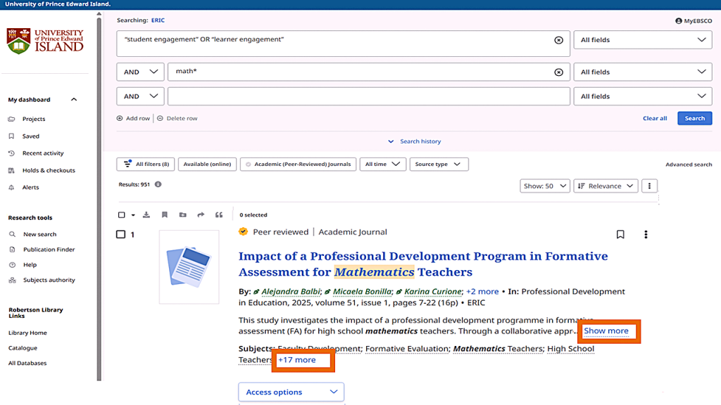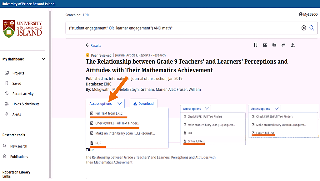 In the Access Options dropdown, the Full Text from ERIC link should take me to the full text of this article. So will a Check@UPEI (Full Text Finder) link, a PDF link, or a link that says something like “Online full text” or “Linked full text.”