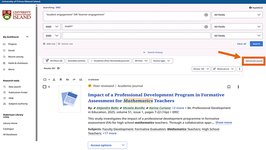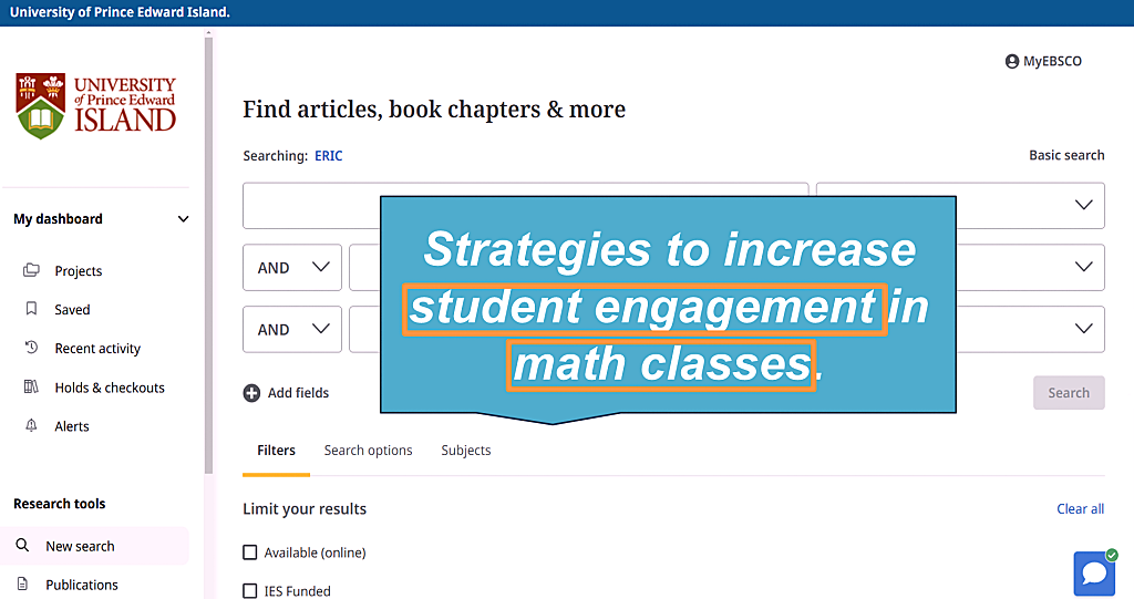 As an example, I’ll search for information about strategies to increase student engagement in math classes. ERIC uses a keyword-based search, so I only want to search for the most important words in my topic. In this case, there are two main parts to my topic: student engagement and math classes.