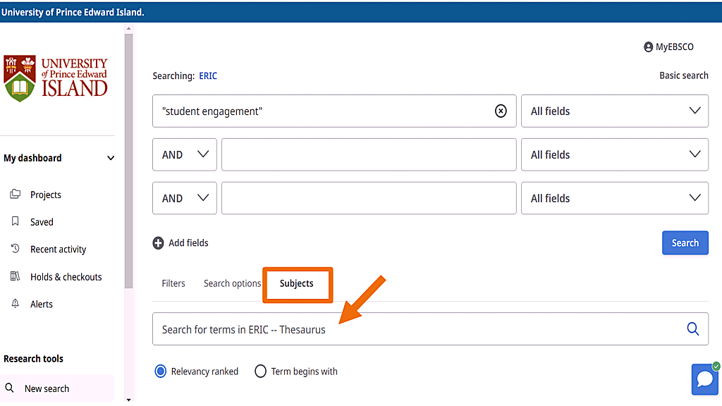 In ERIC, I can also use the thesaurus to find out what terms are used in ERIC’s official thesaurus. This is under the Subjects tab.