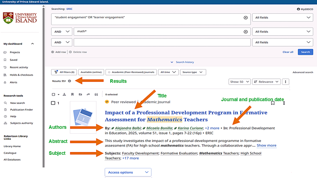 So I’ll add “learner engagement” as a search term. Searching for “student engagement” OR “learner engagement” will help me find any articles that use “student engagement” in places like the title or abstract, while also including articles that have “learner engagement” in their standardized subject terms.