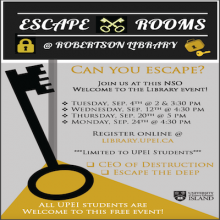 As part of NSO and Welcome to Robertson Library, we are presenting two escape rooms in the Library weekly throughout September – CEO of Destruction and Escape the Deep.