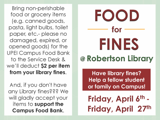And, if you don't have any Library fines??? We will gladly accept your items (as mentioned above) to support the UPEI Campus Food Bank.