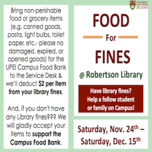 Bring non-perishable food or grocery items (e.g. canned goods, pasta, light bulbs, toilet paper, etc.- please no damaged, expired, or opened goods) for the Campus Food Bank to the Service Desk in the Library from Saturday, November 24th to Saturday, December 15th, 2018 and we’ll deduct $2.00 per item from your library fines.