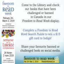 We encourage you to come to the Library and check out books that have been challenged or banned in our Freedom to Read Week display. We also have a selection of books “under wraps” which were banned/challenged in Canada, with an excerpt of why they were challenged. Test your knowledge to see if you can guess their titles!