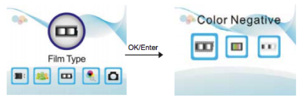 Use the Left/Mirror and Right/Flip to select your film type, and confirm your selection by pressing OK/Enter. The most common choices are Color Negative and Slide Positive