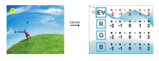 Once you are satisfied with the EV settings, press OK/Enter to confirm and proceed to Red, Blue and green values.