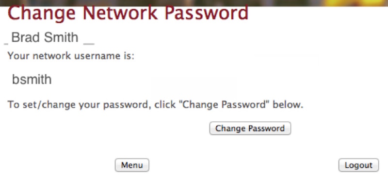 After clicking Go you will be presented with a page listing your UPEI username and a button to change your password. Next you should make note of your network username and click the change password button to set a new password. Completing this process insures your account is unblocked and ready for use.