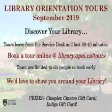 Not only will you learn about your Library's services and resources by attending a Library Orientation Tour, but your name will also be entered in a draw to win either a $40 gift card to Cineplex Cinemas Charlottetown or a $15 gift card to Indigo!