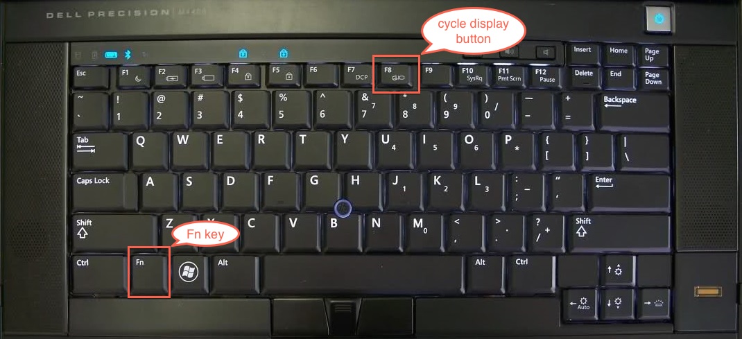 - Next look for a key on the laptop keyboard that cycles the display, normally this is one of the Function keys along top. In our example pictured below it is the F8 key.