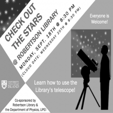 Robertson Library and the UPEI Department of Physics are celebrating Science Literacy Week, September 18th-24th, by co-sponsoring a star gazing event on Monday, September 18th at 8:30 pm  Wednesday, September 20th at 8:30 pm postponed until October
