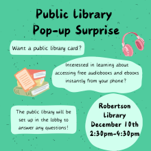 On Tuesday December 10th, the public library visits you! Special guest Ray MacLeod will be in the Robertson Library from 2:30-4:30p to talk about the public library system and to register members of the UPEI community for their own public library cards. Come learn about the Library of Things.