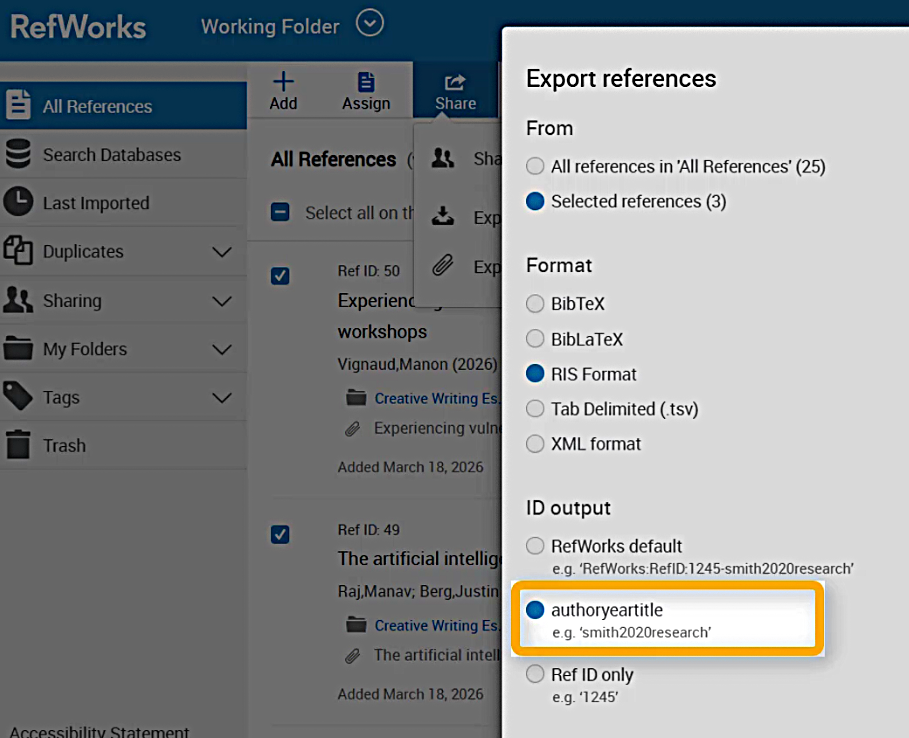 If you want to export only certain references, select them using the checkbox on the left, then select “Share.”