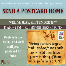 Write a postcard to your family and/or friends back home to let them know you're thinking of them while you're here at UPEI! Postcards are FREE - and we'll mail your postcard for you!!