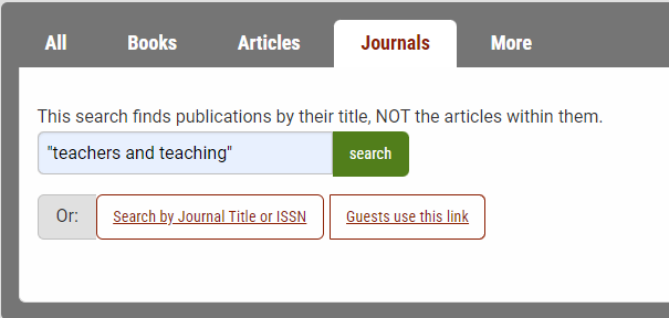 On the library's homepage, choose the Journals search tab. Type or paste the journal's title in the search box and put it in quotation marks. Then, click the search button.